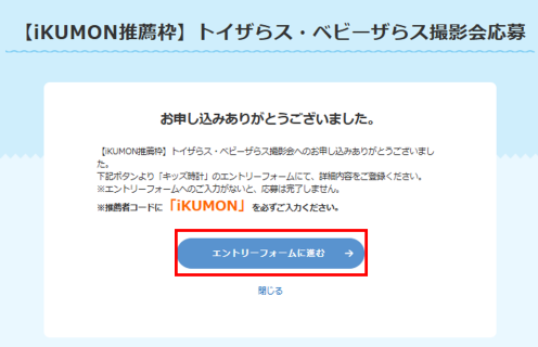 申し込み後に表示される、「エントリーフォームに進む」から、「キッズ時計」のページにて、推薦者コードなど必要事項を入力してエントリーをお忘れなく!