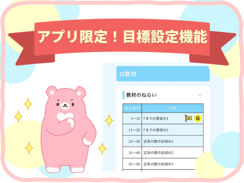 がんばった過程や目標までの目安がわかり、「KUMONステップアップテスト」受験資格進度や中学課程教材などの目安もマークで表示されるので、日々のモチベーションアップにおすすめです★