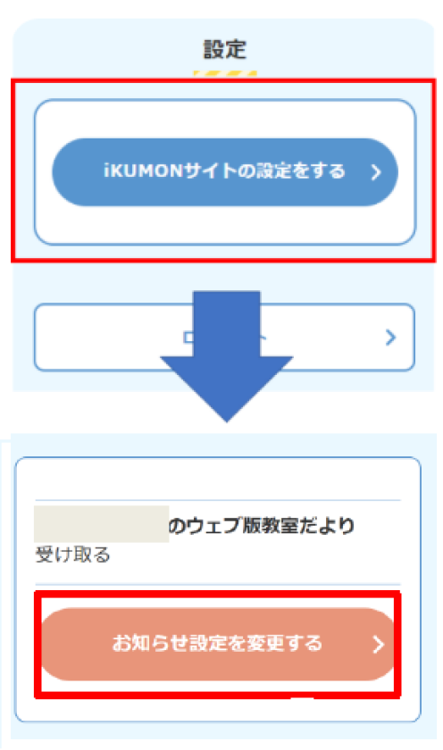 ログイン後、マイページの「設定」より「iKUMONサイトの設定を変更する」(青いボタン)を押してください。「●●教室のウェブ版教室だより」の画面に遷移しますので、「お知らせ設定を変更する」(ピンク色のボタン)から「受け取る」に設定してください。